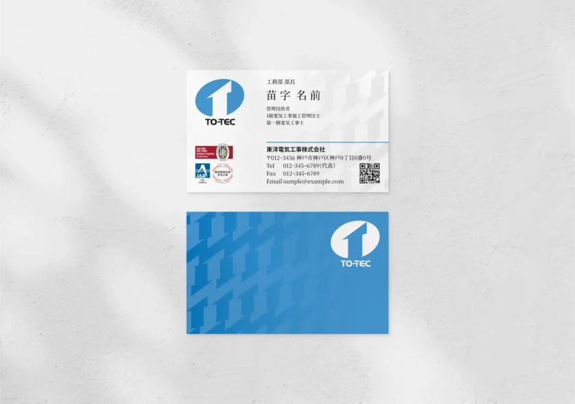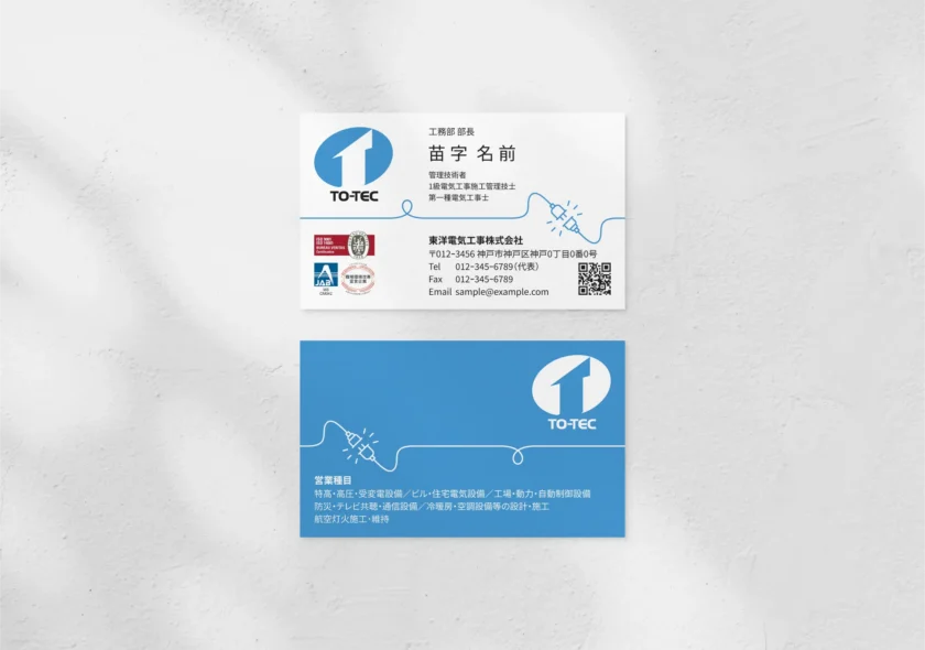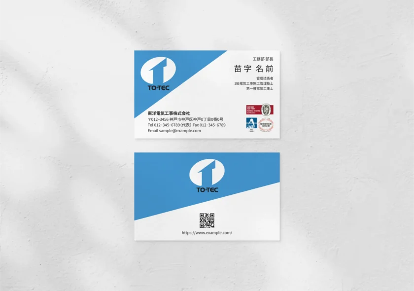 名刺に選択肢電気工事会社の名刺をデザインしました。一般家庭から公共施設まで、電気工事を通してインフラを支える「東洋電気工事」。カジュアルからフォーマルまで、信頼関係の始まりに相応しいデザインを心掛けています。